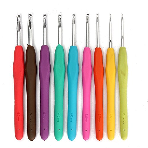 Ruikey - Set di 9 uncinetti in alluminio multicolore, con manico in gomma morbida, per lavori a maglia, ideale per principianti e professionisti