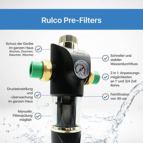 Rulco Filtro dell'acqua con riduttore di pressione. Filtro dell'acqua con connettore: 1" e 3/4". Filtro dell'acqua domestico con sistema prefiltro da 40 micron.