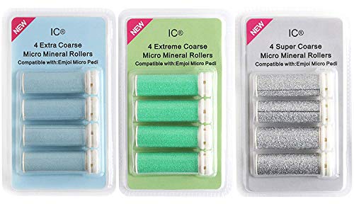 12 rulli di ricambio con micro minerali per Emjoi Micro-Pedi, 4 extra, 4 extreme e 4 super, compatibili con Emjoi Micro-Pedi, per levacalli Emjoi Micro Pedi, modelli extra, super e extreme, colore blu, verde e argento, 12 pezzi