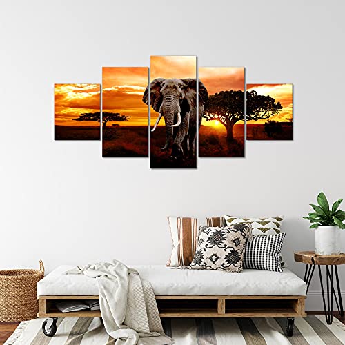 Runa Art - Quadri Africa Elefante 200 x 100 cm 5 Pezzi XXL Decorazione Murale Design Arancia 001251a