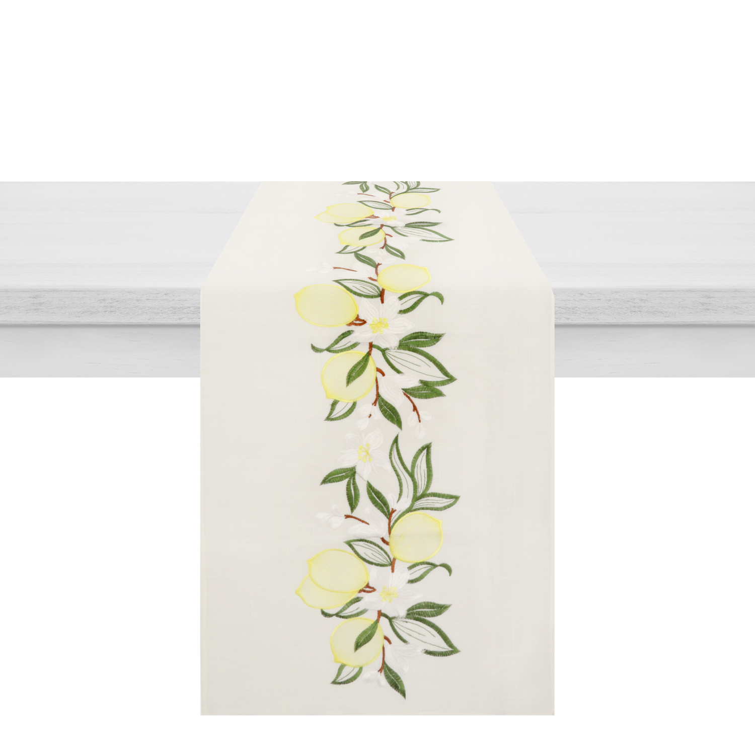 Per apparecchiare una tavola per due persone in modo originale, puoi utilizzare questo elegante runner in tessuto. Posizionandolo lungo il lato corto del tavolo, sarà la base perfetta per appoggiare piatti, posate e bicchieri preservando la superficie da urti ed eventuali schizzi di cibo e bevande. Aggiungerà alla tua mise en place un tocco tipicamente estivo, fresco e colorato, grazie al decoro ricamato a tema limoni. Il runner è lavabile in lavatrice a 30° con centrifuga normale. Non asciugare in tamburo e stirare a una temperatura massima di 110°. Misura: 50x150 cm.