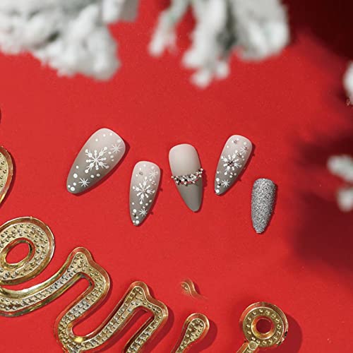 RUNRAYAY Natale Gradiente Grigio Ballerina Stampa Unghie False con Fiocco di Neve Unghie Strass, Mandorla Naturale Coffin Stick On Unghie Finte Dita