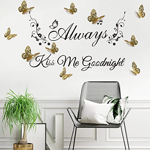 Gli adesivi da parete includono detti romantici ispiratori, Baciami sempre buona notte. Con farfalle 3D dorate, decorazioni da parete calde e dolci. Rendi ogni notte piena di romanticismo.