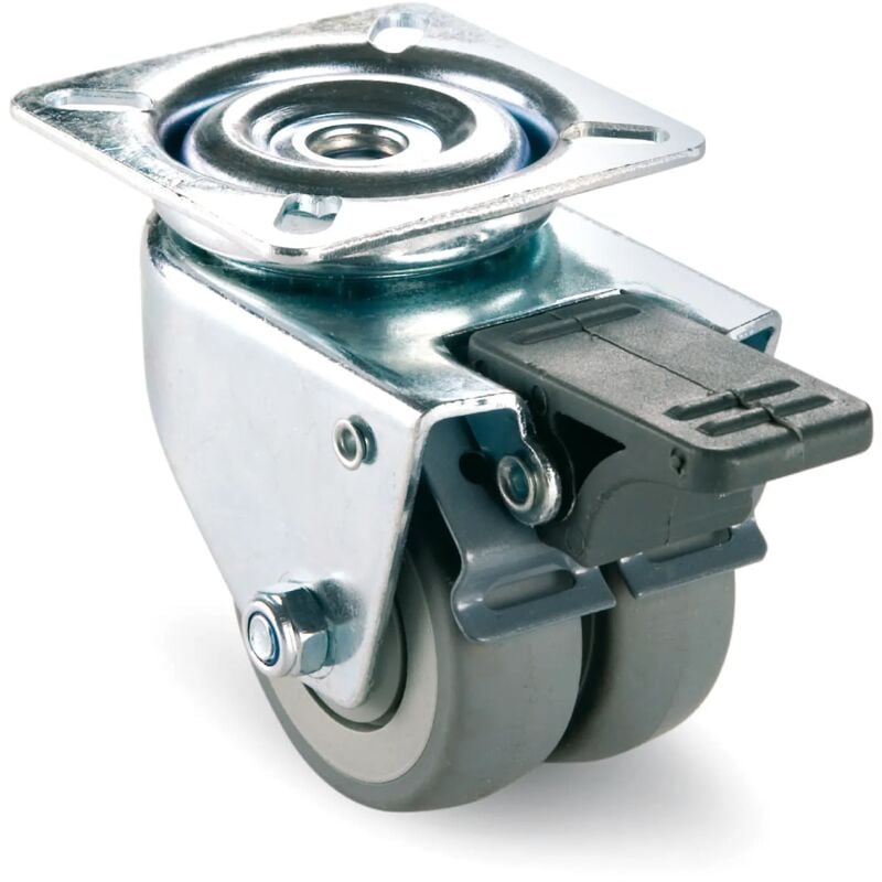 Ruota per arredamento,supporto in acciaio stampato zinco-cromato ad alto spessore,piastra girevole mm.60x60 con dispositivo di bloccaggio ruota e piastra. Ruota in gomma grigia antimacchia d.50x18 mm,nucleo in materiale termoplastico. Portata kg.55 (dinamica). Altezza mm.73.