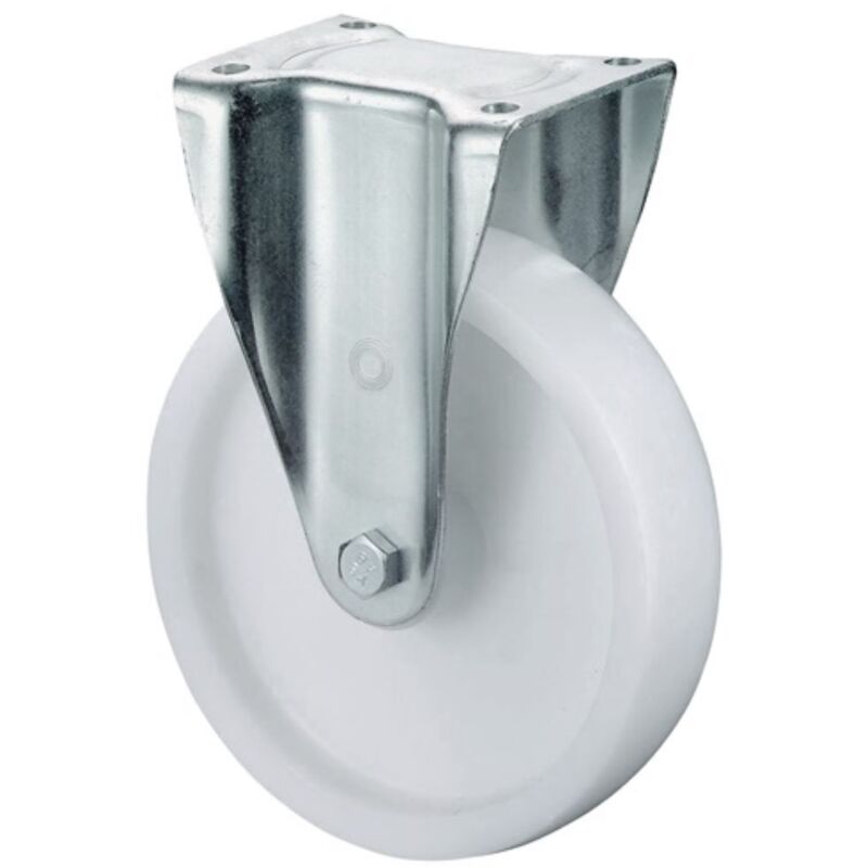 Rotolo di attrezzature per il trasporto pesante · Alloggiamento in lamiera di acciaio, zincato-cromato · Asse ruota avvitato · Cuscinetti a rulli · Ruota in plastica (naturale) · corrosione insensibile · resistente alla benzina, al gasolio, agli oli e ai grassi vegetali e animali · con chiusura a piastre Altre caratteristiche tecniche: · Foro a vite Ø: 11mm · Tipo di attacco: con piastra a vite · Rimozione del foro a vite: 80 x 60 mm