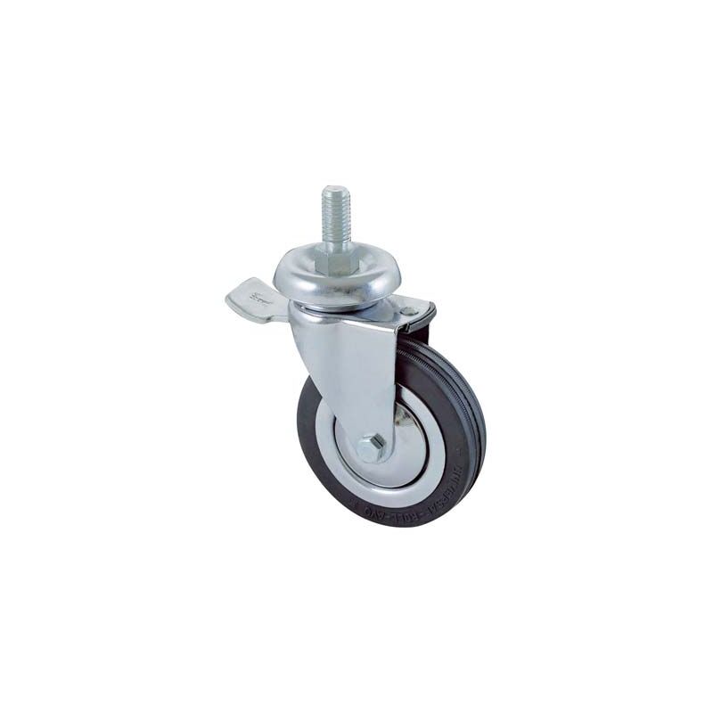 In gomma nera, con parafili e flange in acciaio stampato, rotante su cuscinetti a sfera. Piastra girevole con freno e perno. Esecuzione: cromata.