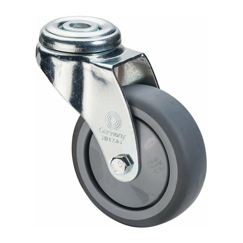 Rotolo di apparecchi · Alloggiamenti in lamiera di acciaio, zincati- cromati · corrosione insensibile · corona a sfera a due file nella testa della forcella · pneumatici in gomma termoplastica (grigio) · su corpi ruota di plastica · Cuscinetti a sfera · Fissaggio mediante foro posteriore Ø 10,2 mm Ulteriori caratteristiche tecniche: · Alloggiamento superficiale: zincato-cromato · Supplemento: Standard · Alloggiamento del materiale: lamiera d'acciaio