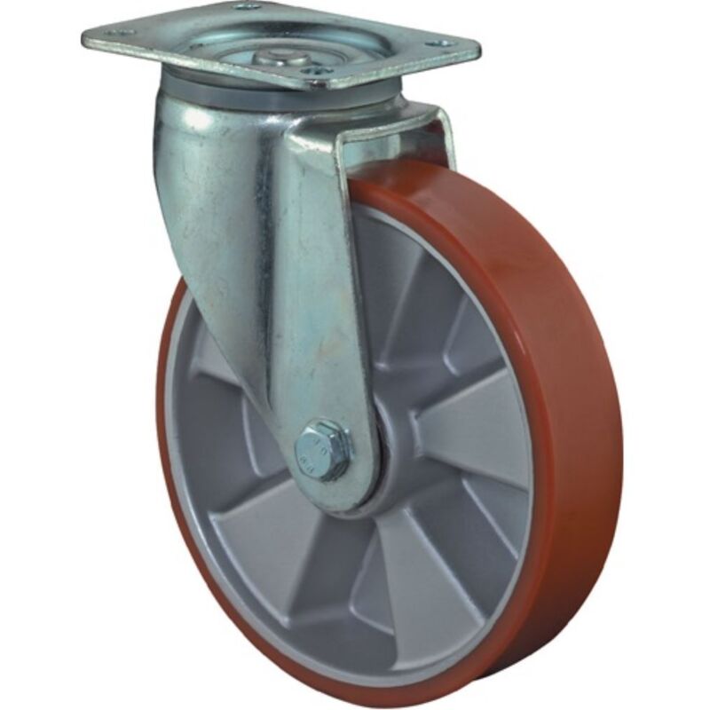 Ruolo direttivo · Capacità di carico fino a 550 kg · alloggiamento stabile in lamiera di acciaio · zincato- cromato · corona a sfera a due file nella testa della forcella · Battistrada in poliuretano fusa 95+/- 3 Shore A · Corpo ruota in alluminio · Cuscinetti a sfera · con chiusura a piastre Altre caratteristiche tecniche: · Alloggiamento superficiale: zincato-cromato · Alloggiamento del materiale: lamiera d'acciaio