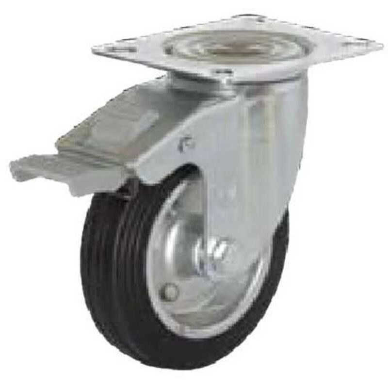 Ruota in gomma nera munita di supporto rotante e freno anteriore, particolarmente indicata per essere montata su carrelli per il trasporto di carichi leggeri come carrelli portautensili, piccoli ponteggi mobili, cassonetti per la raccolta di rifiuti. La ruota in gomma di Tellure Rota, adatta a tutte le tipologie di pavimentazioni incluse quelle esterne, consente un agevole superamento degli ostacoli. Caratteristiche: Rivestimento costituito da un anello calettato in gomma standard durezza 80 Shore A;