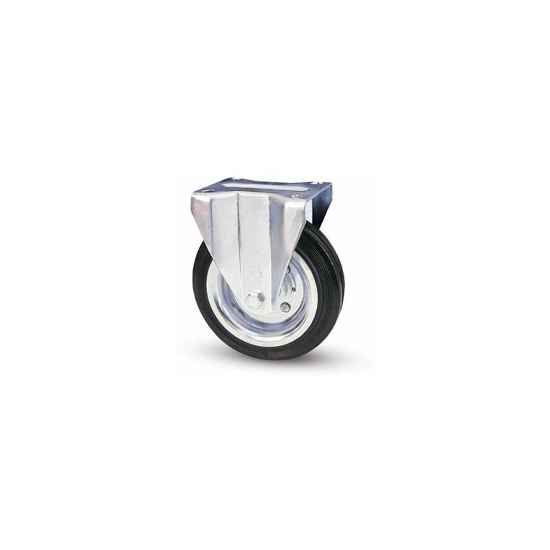 Ruote con rivestimento in gomma e flange in acciaio. Flange in acciaio stampato zinco-cromato. Supporti Tipo Medio Assemblaggio con dado autobloccante. Diametro: 125 mm Portata: 100 kg