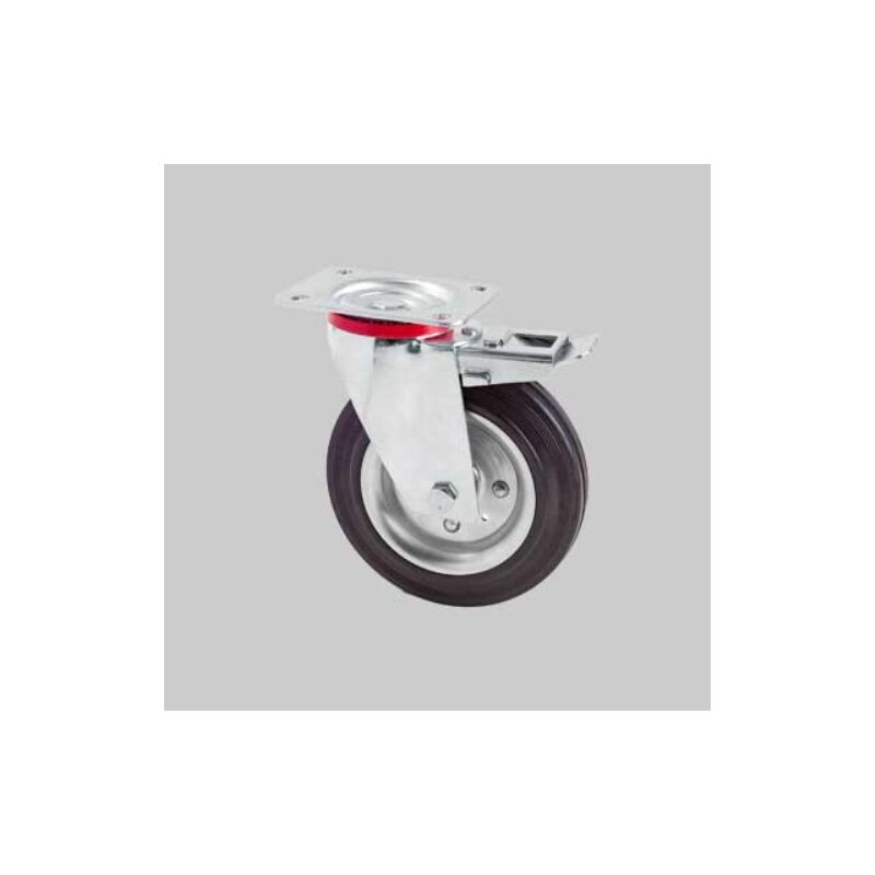 Supporto a piastra girevole in acciaio stampato rotante su doppia corona di sfere con freno. Rivestimento in gomma piena, flange in acciaio stampato zinco-cromato, mozzo su gabbia a rulli. Ruota industriale girevole art. 103 avo c/freno 80x25 mm - portata 50 kg ALDO VALSECCHI Ruote avo