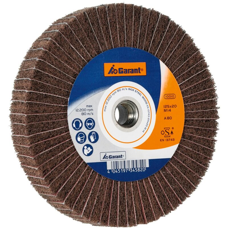 Lamelle disposte a ventaglio attorno all'asse dell'utensile. Attacco diretto M14. Estremamente flessibile. Combinazione di tessuto abrasivo (A) e tessuto non tessuto(A). Uso: Per levigatura di precisione su superfici arcuate. Dati tecnici Sigla materiale abrasivo A Velocità periferica massima m/s 30 Legno m/s idoneo Larghezza disco mm 20 INOX m/s idoneo Filettatura M14 Percentuale di ferro, zolfo e cloro % < 0,1 Ti m/s limitatamente adatto Acciaio < 60 HRC m/s limitatamente adatto Acciaio < 1400 N/mm² m/s idoneo Acciaio < 900 N/mm² m/s idoneo Acciaio < 55 HRC m/s idoneo Vernice m/s limitatamente adatto Alluminio, CFRP m/s idoneo ⌀ Disco mm 125 CuZn m/s idoneo Materiale abrasivo Corindone normale (A) GG(G) m/s idoneo a secco idoneo Al/Mg m/s idoneo Attributo del nome del prodotto ⌀ 125 mm×20 mm Tipo di prodotto Mola lamellare in tela abrasiva Grana 80