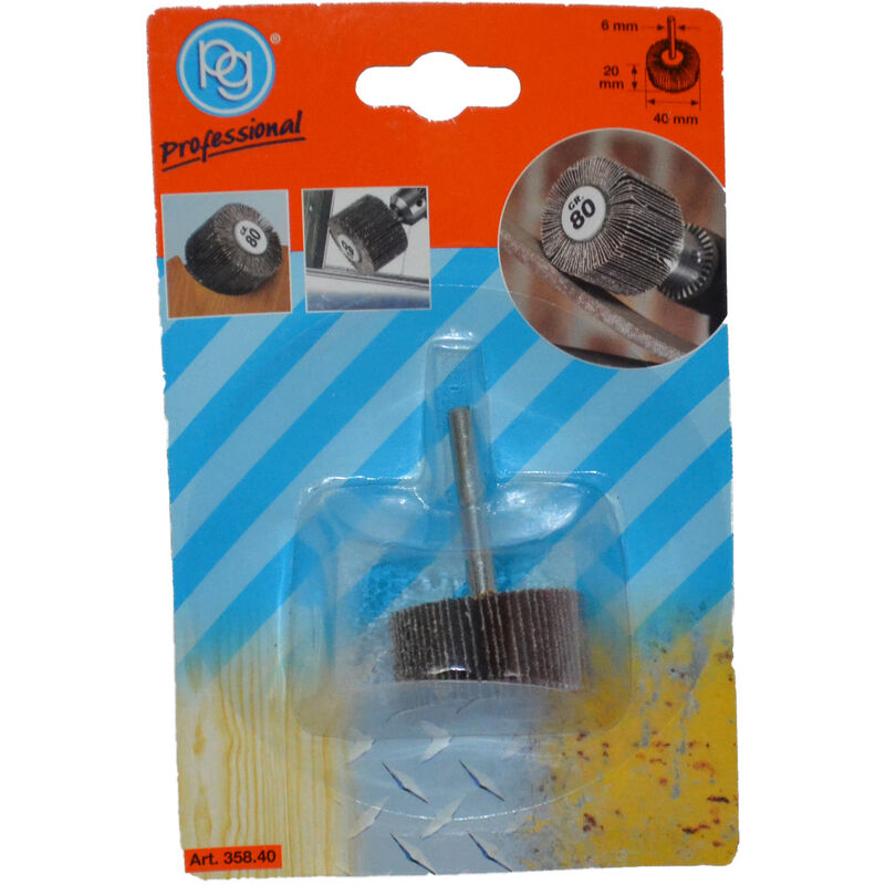Ruota mola lamellare - Grana 80 - Gambo 6 mm - Dimensioni 40x20 mm Ruota mola lamellare abrasiva con grana 80, gambo 6 mm, adatta su legno, metallo e materie plastiche. Dimensione 40x20 mm.