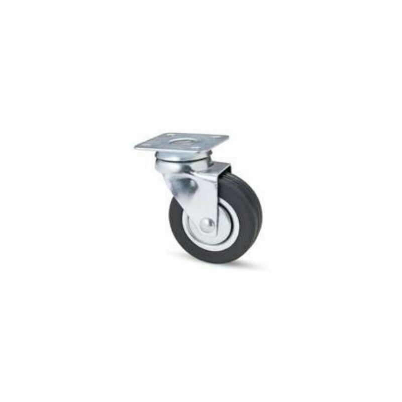RUOTA IN GOMMA PIASTRA GIREVOLE mm. 60 Supporto in acciaio stampato rotante su doppia corona di sfere con dispositivo di bloccaggio ruota.Esecuzione: zincocromato e ottonato.Ruota in gomma nera o grigia.L'impiego è consigliato per mobili per ufficio, espositori, mobili metallici etc. Viti Suggerite: M 8-10 x 15-30Altezza: 56 mmAttrito Statico: 300 NAttrito Dinamico: 200 N
