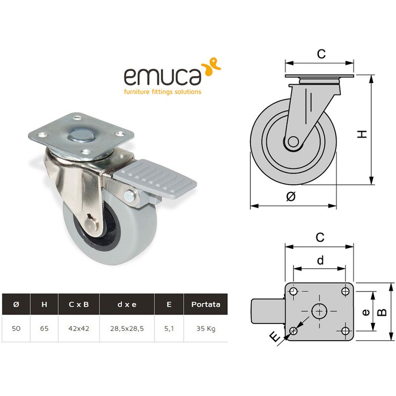 Ruota, marca Emuca Caratteristichetecniche: -Ruota Plastica Grigia -Nucleo in polimero termoplastico -Anello in gomma piena grigia antitraccia -Con Freno -Supporto ruotante in acciaio cromato opaco. -Piastra girevole mm.43x43 -Portata: Kg. 35 -Diametro: mm. 50 La confezione comprende: -nr.01 Ruota Perché scegliere Emuca? Nel Gruppo Emuca progettiamo, fabbrichiamo e commercializziamo un'ampiagamma di prodotti destinati ai settori del mobile, ferramenta e bricolage. Le nostre sedi a Valencia (Spagna), Padova (Italia), Chelmsford (Regno Unito),Nantes (Francia) e Lisbona (Portogallo) ci permettono di essere in contattodiretto con le ultime tendenze del settore del mobile che il nostroDipartimento Ricerca & Sviluppo trasferisce poi ai nostri prodotti. Per garantire l'efficienza delle nostre operazioni contiamo, in Spagna, su unafabbrica che offre soluzioni integrali in alluminio. Siamo rivenditori di Ruote Girevoli, Fisse o ad Incasso ZingaroWeb è rivenditore di Ruote Girevoli, Fisse o ad