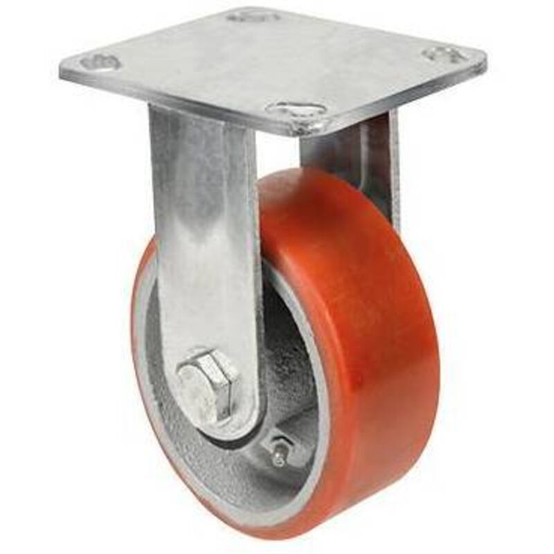 In ghisa rivestita di poliuretano. Supporto in acciaio con piastra fissa 95 x 65 mm. Dimensioni ø 100 x 32 x h 129 mm. Portata max 130 kg.