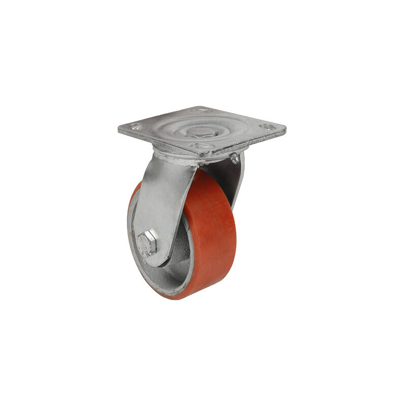 In ghisa rivestita di poliuretano. Supporto in acciaio con piastra girevole 93 x 63 mm. Dimensioni ø 100 x 32 x h 129 mm. Portata max 130 kg.