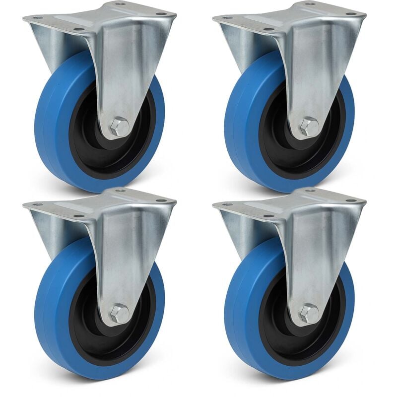 4 ruote fisse con diametro da 160 mm e la piastra di montaggio 135 x 110 mm Il corpo ruota è in plastica e l'alloggiamento è in lamiera d'acciaio. Max capacità di carico a ruota: 300 kg La ruota elastica offre un'ottima scorrevolezza Silenziose, con una buona ammortizzazione, sono adatte per trasportare merci delicate Con il set di quattro ruote fisse è possibile trasportare facilmente carichi pesanti. Le rotelle possono essere montate sotto uno strumento da trasporto per spostare facilmente il carico da un luogo all'altro. Il carico massimo per ciascuna ruota è di 300 kg. Il corpo della ruota è in plastica, rivestito in materiale elastico blu particolarmente scorrevole. L'asse avvitato conferisce stabilità alla ruota fissa. L'alloggiamento è realizzato in lamiera d'acciaio zincata e cromata ed è dotato di un doppio gruppo di sfere e gabbie. Le ruote fisse offrono un elevato comfort di movimento, sono particolarmente silenziose e hanno una buona capacità di ammortizzazione, ideale