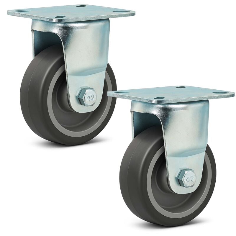 Due ruote fisse con 75 mm di diametro e piastra di montaggio da 77 x 67 mm Il corpo della ruota è in plastica, l'alloggiamento in lamiera di acciaio Il carico massimo è di 75 kg per ruota Pneumatici in gomma termoplastica per un elevato comfort di rotolamento Funzionamento silenzioso e buon ammortizzamento ideale per oggetti delicati Con il set di due ruote fisse è possibile trasportare facilmente carichi pesanti. Le rotelle possono essere montate sotto uno strumento da trasporto per spostare facilmente il carico da un luogo all'altro. Durante lo spostamento si mantiene il controllo della direzione di marcia e si può persino cambiare direzione con facilità. Il carico massimo per ciascuna ruota è di 75 kg. Il corpo ruota è in plastica (polipropilene), con pneumatici in gomma termoplastica (grigia antitraccia). L'asse avvitato rende le ruote stabili. L'alloggiamento è realizzato in lamiera d'acciaio zincata e cromata ed è dotato di un doppio gruppo di sfere e gabbie. Le ruote fisse