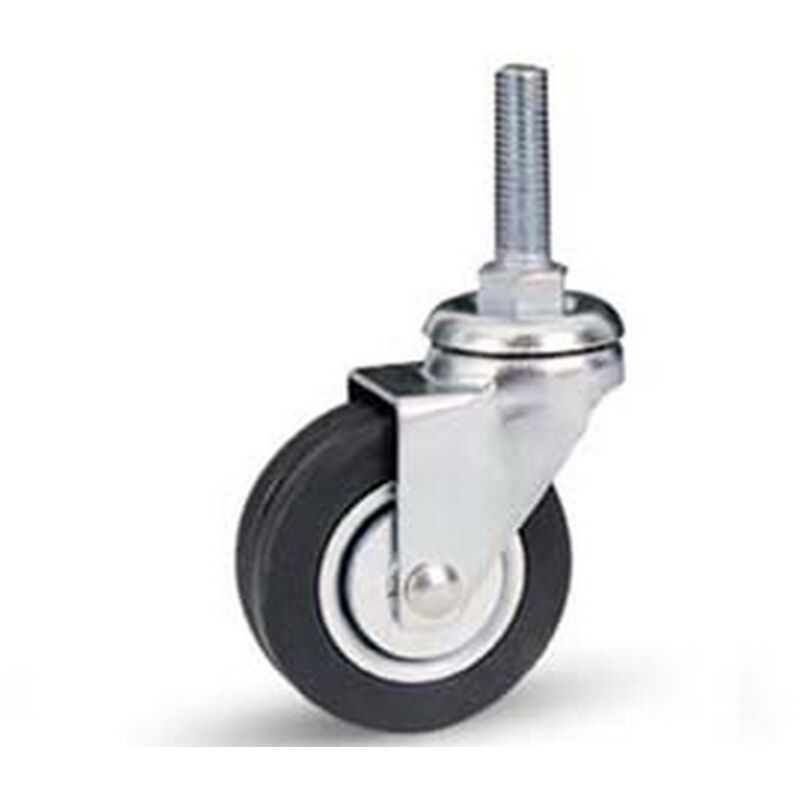 Supporto in acciaio zinco-cromato stampato rotante su doppia corona di sfere - ruota in gomma nera con flange in acciaio stampato, rotante su cuscinetti a sfere - assale imbullonato - l'impiego ? consigliato per mobili per ufficio, espositori, mobili meta