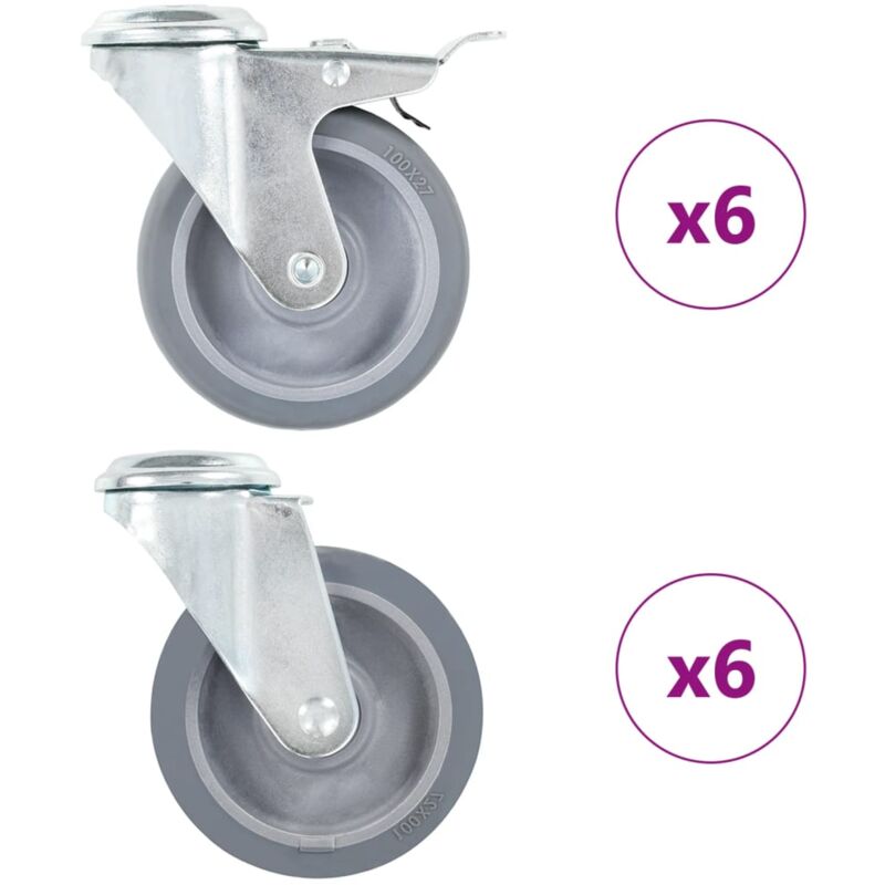 Questo set, composto da 12 rotelle girevoli con foro per bulloni, costituisce l'accessorio perfetto per attrezzature e mobili di piccole dimensioni come banchi da lavoro, carrelli, tavolini da caffè, piantane, scaffali, carrelli della spesa, etc. Le ruote sono realizzate in TPR (gomma termoplastica), un materiale che si distingue per una buona resistenza agli urti e alle vibrazioni e che consente alle ruote di girare in modo fluido e silenzioso. La loro superficie morbida, inoltre, protegge efficacemente il pavimento dai graffi. La struttura in ferro zincato è altamente resistente alla ruggine e garantisce maggiore robustezza e durata delle ruote. Metà delle ruote girevoli sono dotate di sistema frenante per garantire una maggiore flessibilità di utilizzo. Ogni ruota ha una capacità di carico massima pari a 60 kg. La consegna include 6 ruote girevoli con foro per bulloni e 6 ruote girevoli con foro per bulloni con freno. Colore: Grigio Materiale: TPR (gomma termoplastica) e ferro