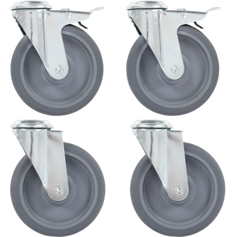 Questo set, composto da 4 rotelle girevoli con foro per bulloni, costituisce l'accessorio perfetto per attrezzature e mobili di piccole dimensioni come banchi da lavoro, carrelli, tavolini da caffè, piantane, scaffali, carrelli della spesa, etc. Le ruote sono realizzate in TPR (gomma termoplastica), un materiale che si distingue per una buona resistenza agli urti e alle vibrazioni e che consente alle ruote di girare in modo fluido e silenzioso. La loro superficie morbida, inoltre, protegge efficacemente il pavimento dai graffi. La struttura in ferro zincato è altamente resistente alla ruggine e garantisce maggiore robustezza e durata delle ruote. Due delle ruote girevoli sono dotate di un doppio sistema frenante per garantire una maggiore flessibilità di utilizzo. Ogni ruota ha una capacità di carico massima pari a 80 kg. La consegna include 2 ruote girevoli con foro per bulloni e 2 ruote girevoli con foro per bulloni con doppio freno. Colore: Grigio Materiale: TPR (gomma