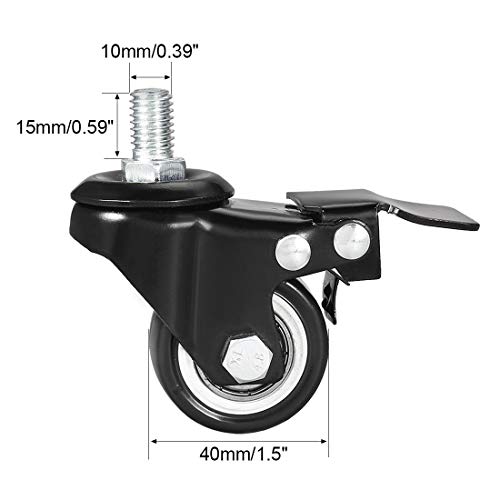 Ruote girevoli da 1,5 pollici in PU con perno filettato a 360 gradi con freno, M10 x 15 mm, capacità di carico totale 330 lb, confezione da 4