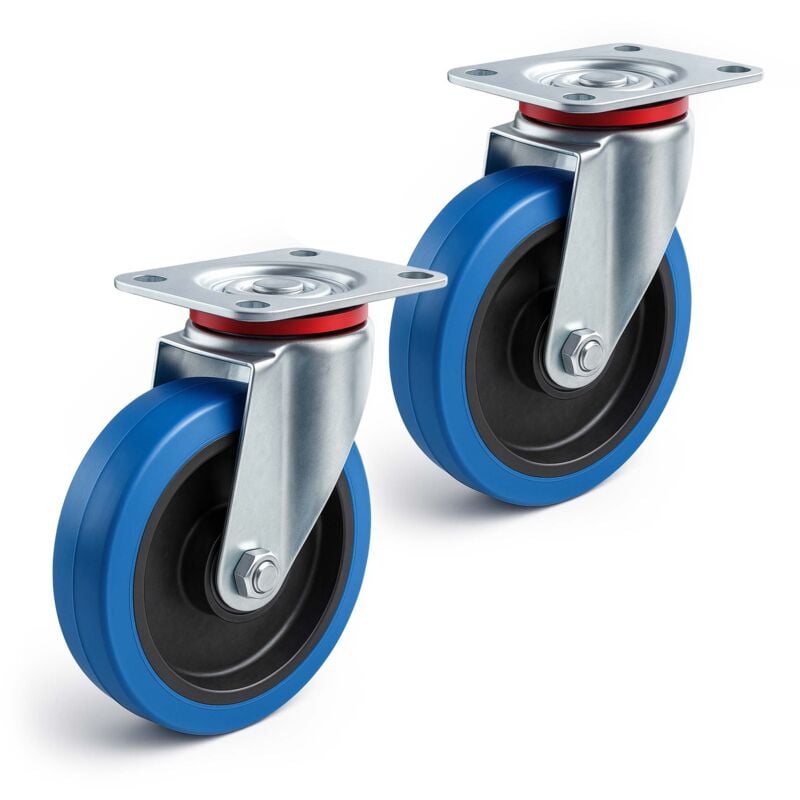Montaggio semplice e rapido - - Le rotelle possono essere installate facilmente sotto qualsiasi dispositivo di trasporto, utilizzando la piastra di montaggio preforata [Manovrabilità ottimale] - Il set garantisce cambi di direzione fluidi e senza sforzo, migliorando l'efficienza nel movimento di carichi pesanti [Capacità di carico] - Ogni ruota supporta un peso massimo di 350 kg, ideale per trasportare oggetti pesanti con facilità e sicurezza [Funzionamento silenzioso] - Buona capacità di ammortizzamento ideale per carichi fragili [Materiali di alta qualità] - Realizzata con corpo in plastica e rivestimento in gomma elastica blu, offre durata e non danneggia il pavimento Con il set di due ruote piroettanti è possibile trasportare facilmente carichi pesanti. Le rotelle possono essere montate sotto uno strumento da trasporto per spostare facilmente il carico da un luogo all'altro. Durante lo spostamento si mantiene il controllo della direzione di marcia e si può persino cambiare