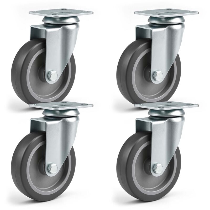 Quattro ruote piroettanti con 75 mm di diametro e piastra di montaggio da 77 x 67 mm Il corpo della ruota è in plastica, l'alloggiamento in lamiera di acciaio Il carico massimo è di 75 kg per ruota Pneumatici in gomma termoplastica per un elevato comfort di rotolamento Funzionamento silenzioso e buon ammortizzamento ideale per oggetti delicati Con il set di quattro ruote piroettanti è possibile trasportare facilmente carichi pesanti. Le rotelle possono essere montate sotto uno strumento da trasporto per spostare facilmente il carico da un luogo all'altro. Durante lo spostamento si mantiene il controllo della direzione di marcia e si può persino cambiare direzione con facilità. Il carico massimo per ciascuna ruota è di 75 kg. Il corpo ruota è in plastica (polipropilene), con pneumatici in gomma termoplastica (grigia antitraccia). L'asse avvitato rende le ruote stabili. L'alloggiamento è realizzato in lamiera d'acciaio zincata e cromata ed è dotato di un doppio gruppo di sfere e gabbie.