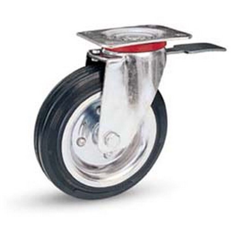 Supporto tipo medio rotante con fermo in acciaio stampato zinco-cromato su doppia corona di sfere e anello parapolvere sul giro di sfere - ruota con rivestimento in gomma piena nera e flangia in acciaio - mozzo su cuscinetti a sfera schermati - assemblagg