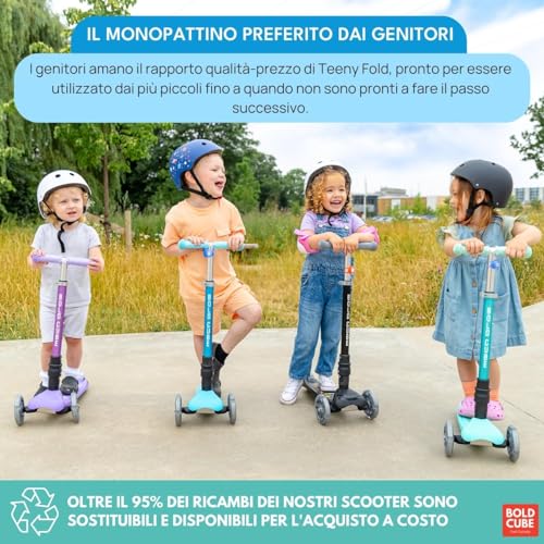 ROBUSTO PRIMO SCOOTER - Il monopattino Teeny FOLD di BOLDCUBE è il perfetto tri-scooter entry level per i bambini dai 3 agli 8 anni. Progettato con un sistema di sterzo Lean to Steer / Tilt to Turn e completamente autobilanciante, è il primo monopattino ideale per i bambini e i ragazzini che sviluppano l'equilibrio e la fiducia per affrontare i marciapiedi!