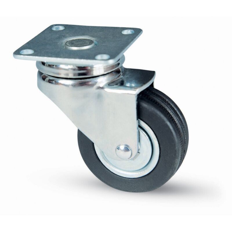 Articolo 150 in gomma. Montata su mozzi a sfere. Supporto a forcella in acciaio stampato e cromato. Piastra girevole. Diametro mm 50x18 Portata 35 kg