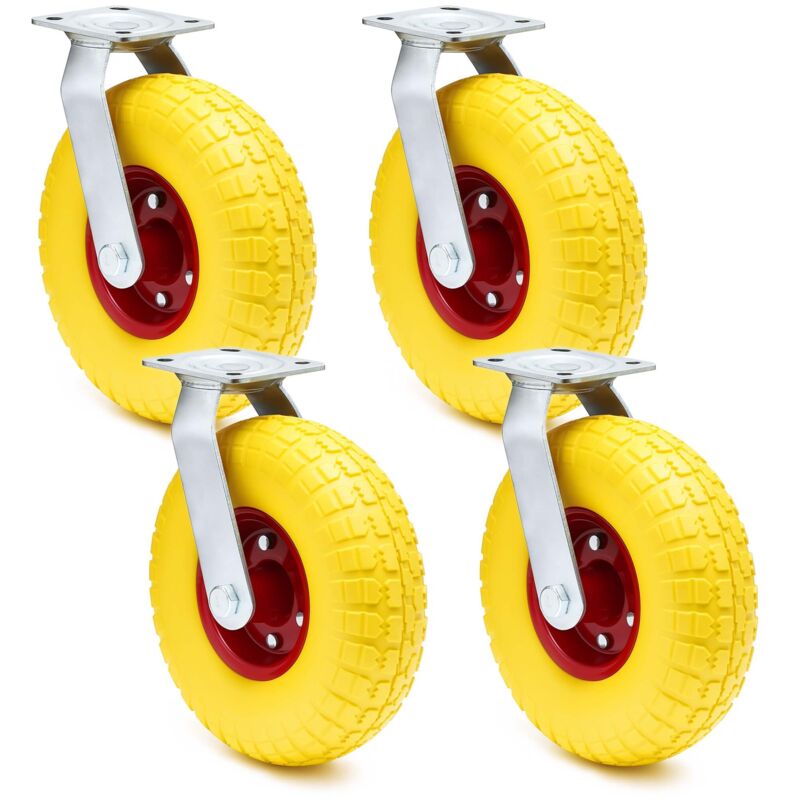 Quattro ruote piroettanti con staffe rotanti e cerchi in metallo Ruote antiforatura con diametro di 258 mm Larghezza ruota 78 mm, altezza staffa inclusa 302 mm Portata: max. 150 kg per ruota Comprese piastre di montaggio per l'aggancio su ausili come carrelli a mano Il set contiene quattro ruote gialle con cerchi in metallo e staffe con piastre di montaggio per l'installazione di strumenti da trasporto come carriole, carrelli di trasporto o rimorchi. Questi pneumatici antiforatura sono realizzati in materiale solido e non sono dotati di camera d'aria, pertanto non c'è il rischio di perdite. Le ruote sono realizzate in schiuma poliuretanica a pori fini e non hanno nulla da invidiare agli pneumatici ad aria in termini di comfort di marcia. La portata massima è di 150 kg per ogni ruota girevole, in modo da poter spostare anche le merci più pesanti. Diametro ruote: 258 mm Larghezza ruote: 78 mm Altezza staffa incl.: 302 mm Altezza piastra: 5 mm Larghezza piastra: 100 mm Altezza