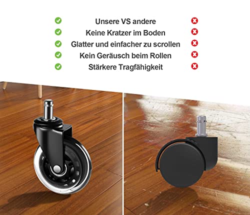 Sicuro per tutti i pavimenti duri: le ruote in gomma offrono un'esperienza più liscia e silenziosa, sia al lavoro che a casa. Mai più tappetini di protezione per il pavimento, nessun graffio sul pavimento (ad esempio piastrelle, parquet, laminato, legno, marmo, granito, pietra, cemento o pavimenti in vinile) con queste rotelle di alta qualità