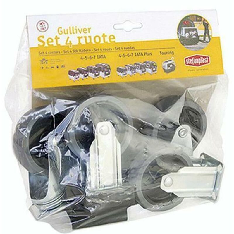 Set composto da 2 ruote fisse e 2 ruote girevoli con freno di colore nero. in busta. adatte per modello gulliver 4-5-6-7 e gulliver touring.4 pezzi