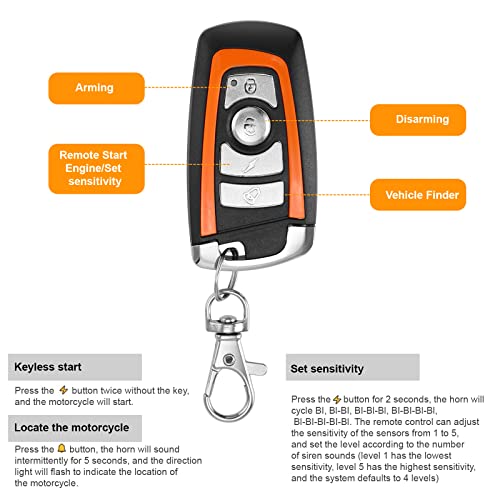 【Avvio e arresto automatici a distanza】 Sistema di allarme per moto senza bisogno di inserire la chiave e facile da usare. Trova l'auto con un clic, l'allarme per auto è comodo per trovare un'auto nel cortile dell'auto. Tra molti veicoli, puoi trovare la tua auto velocemente, che è comoda e veloce.