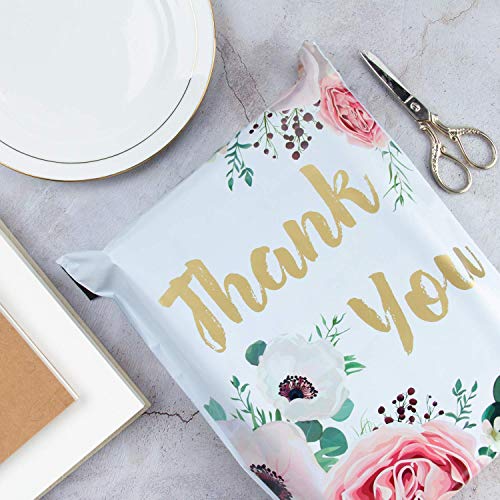 TAGLIA E STAMPA: 50 pezzi poli mailer 10x13 pollici (26x33 cm) inclusi, grazie note e stampa floreale nei poli mailer bianchi