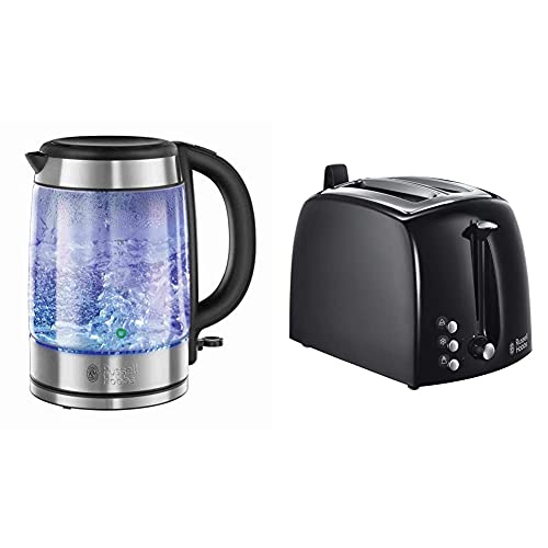 Russell Hobbs Kettle Bollitore 21600-57, 2200 W, 7 Tazze, Vetro, Acciaio Inossidabile, Argento, Trasparente & 22601-56 Tostapane, 850 W, Strato Esterno In Plastica, 2 Scomparti, Nero