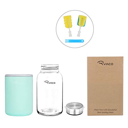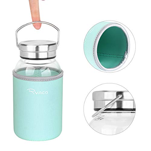 RYACO Bottiglia d'Acqua, 800 ml Bottiglia Vetro Transparent Portatile con Guaina Protettiva in Neoprene e Spugna Pennello per Il Campeggio Viaggi tè Ufficio (800ml, Verde Menta)