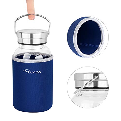 Ryaco Bottiglia d'Acqua, 800 ml Bottiglia Vetro Transparent Portatile con Guaina Protettiva in Neoprene e Spugna Pennello per Il Campeggio Viaggi tè Ufficio (800ml, Zaffiro)