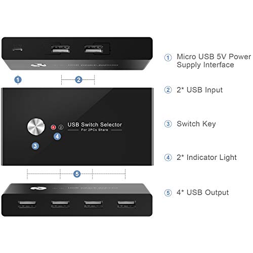 Switch di condivisione USB 2.0 con porta micro USB separata per alimentazione opzionale, che ne ottimizza la compatibilità con più dispositivi, come HDD, videocamere digitali, SSD, ecc. Nota importante: utilizzare l'adattatore 5V standard (non incluso, venduto separatamente) per l'alimentazione. NON è ammesso alcun caricabatterie con uscita a tensione più elevata che potrebbe influire sulle prestazioni del prodotto.