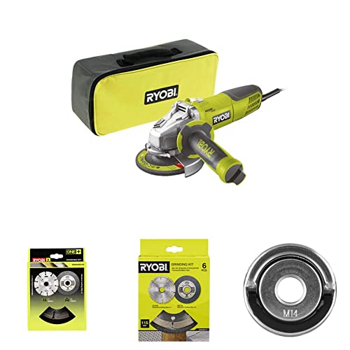 Ryobi b01biutap6 smerigliatrice angolare, 1010 W + Kit da Taglio Disco Smerigliatrice, Set da 6Ryobi RAK6AGD115 - Set di accessori per smerigliatrice angolare + Ryobi RAKEF Smerigliatrice angolare