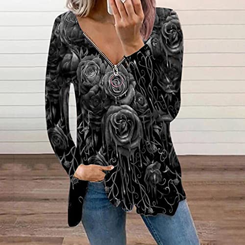 RYTEJFES Maglia a tunica da donna, con scollo a V, stile vintage, motivo floreale, a maniche lunghe, casual, casual, a maniche lunghe, Nero, M