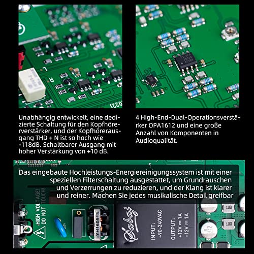 4 amplificatori operazionali doppi di fascia alta OPA1612 e un gran numero di componenti di qualità audio. Il sistema di purificazione dell'alimentazione ad alte prestazioni integrato è dotato di un circuito di filtro dedicato per ridurre il rumore di fondo e la distorsione e il suono è più chiaro e puro. Lascia che ogni dettaglio della musica esca vividamente.