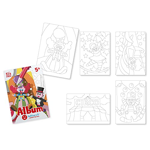 Prodotto: album Sabbiarelli con 5 diversi disegni raffiguranti momenti di vita nel circo, da colorare con la sabbia. 100% Made in Italy