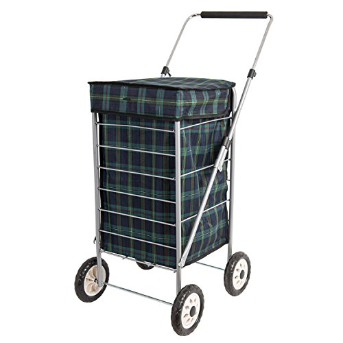 Le 4 ruote su questo carrello rendono più facile la navigazione senza perdere equilibrio e la maniglia easygrip rende per un maggiore comfort quando si spinge il carrello.
