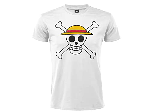 Sabor srl T-Shirt One Piece Cappello di Paglia Logo Teschio Ufficiale. Maniche Corte. 100% Cotone. Unisex. Disponibili in Vari Colori. Taglie da Adulto Ragazzo. (XXL, Bianco)