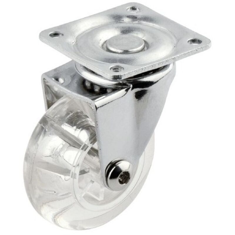 Ruota con supporto a piastra girevole, in acciaio stampato, zincato. Ruota in poliuretano trasparente con nucleo in policarbonato, mozzo a foro passante. Generalmente utilizzate per: vetrine ed espositori per negozi, mobili da casa e da ufficio con bassa portata, cassettiere.