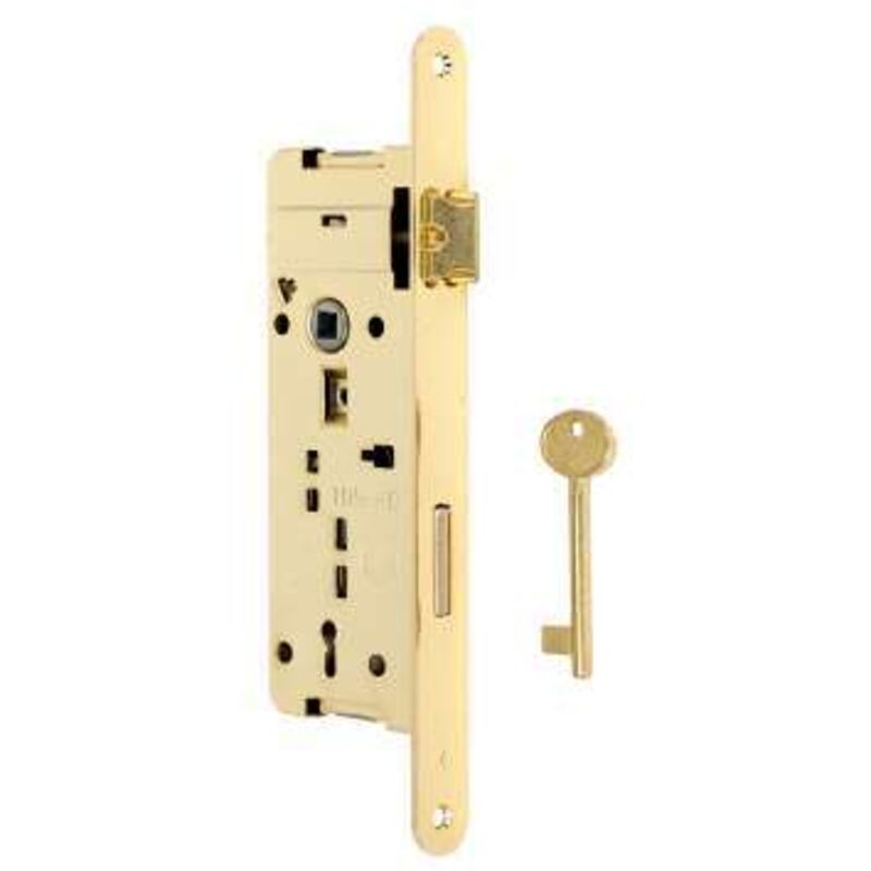 SACAR - SERRATURA A FORO CON CHIAVE DA INFILARE 35MM - IN ACCIAIO OTTONATO serratura a foro chiave da infilare ottonata due mandate. scrocco reversibile con cacciavite. una chiave a cifratura unica. frontale stondato da mm.22 ottonato. quadro per maniglia da mm.8