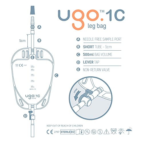 Ugo Sacche Gamba per Urina (x10) - Borsa per il drenaggio delle urine/per catetere, design naturale ergonomico (Pacchetto da 10) (Ugo 1C - 500ml, Tubo Corto, Rubinetto A Leva)
